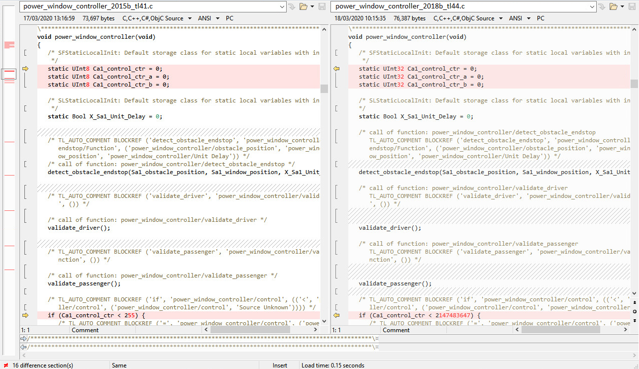 We can actually save a lot of time and effort if we can show that the code from the old model and the new migrated model are the same. Let’s generate code from our migrated model, then grab the C files containing the main step function (original & migrated) and throw them into Beyond Compare:
