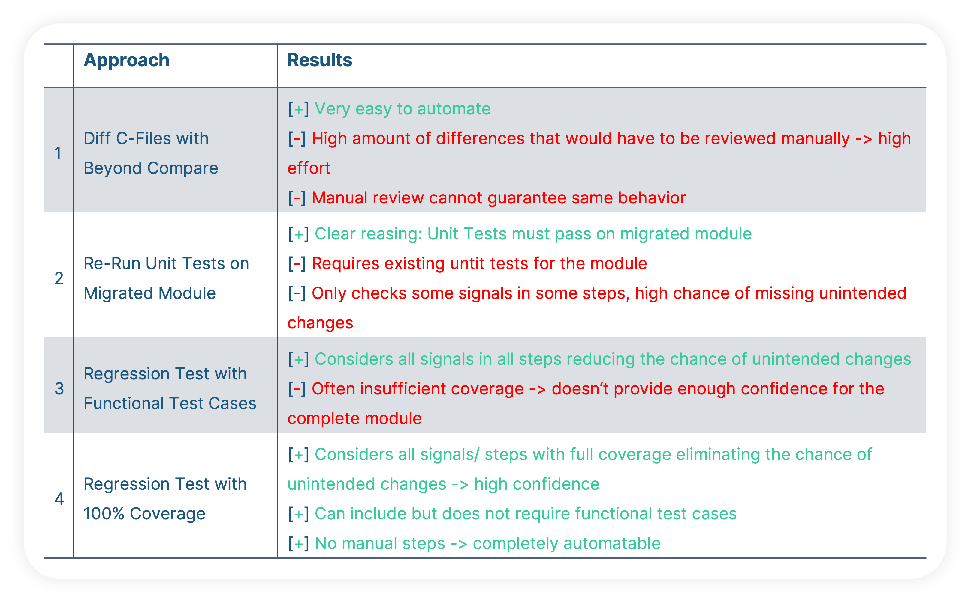 The test case was designed to check if a particular part of our system under test reacts correctly to a specific situation. This leaves a lot of room for deviation. Even if our module still meets the requirements, we don’t want to miss any changes in its behavior. Naturally, a requirements-based test case does not check the exact value of every signal in every step of the execution, that would be pretty inefficient. After all, that’s not what a requirements-based test is supposed to do thus we cannot only rely on passed test cases when checking the impact of the migration. I guess we need yet another approach that takes this into account.