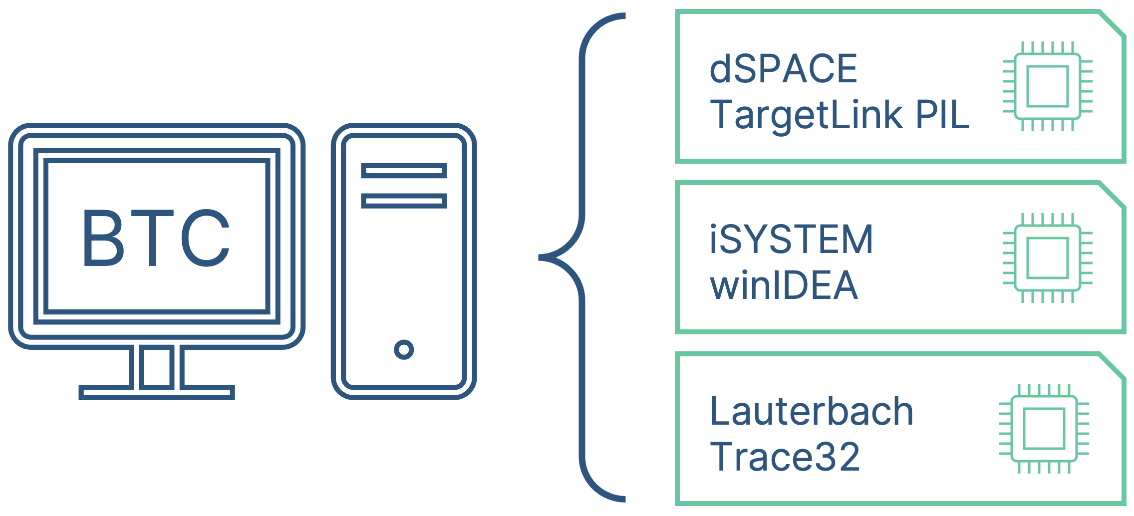 For non-TargetLink users, BTC EmbeddedPlatform can be enhanced with additional Add-Ons enabling Processor-in-the-loop (PIL) Testing by integrating iSYSTEM winIDEA or Lauterbach Trace32.