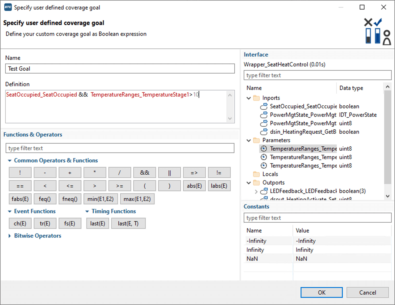 For even more flexibility, the User-defined Coverage Goals feature provides a powerful editor with full access to all interface variables in which you can express additional coverage goals as boolean or mathematical expressions. Would you like to know if two outputs can have a particular value at the same time? The answer is just one click away.