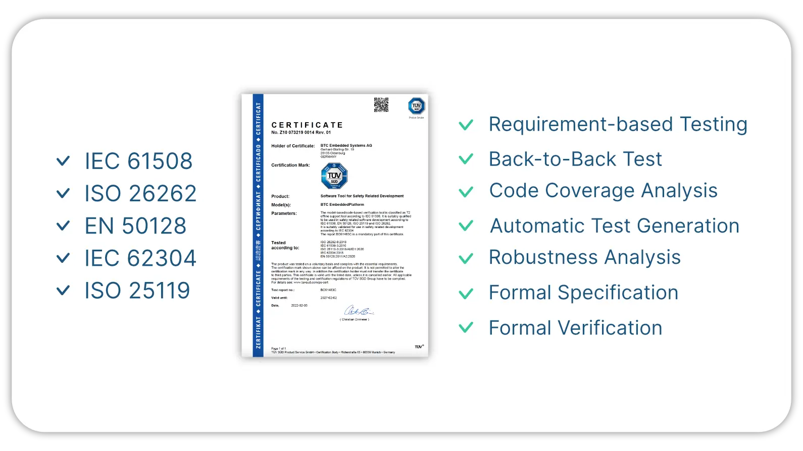 The certificate adresses all use cases within BTC EmbeddedPlatform, including: